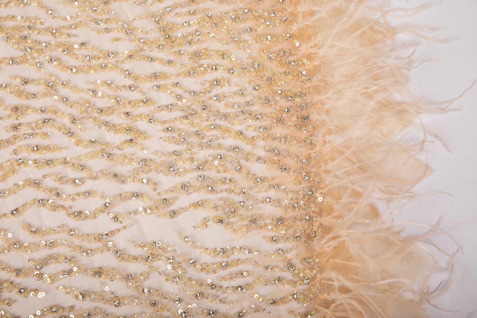 A delicate blend of faux feathers and dainty beads against a backdrop of light peach.